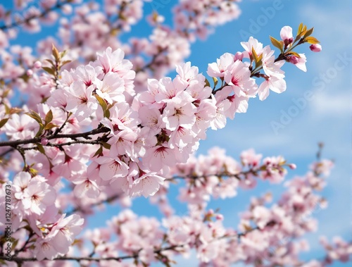 Fototapeta premium Pink Cherry Blossom Branch Against Blue Sky