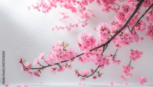 © Lasvu, Obraz premium Pink cherry blossom branch with flowers on a soft background. Springtime floral scene. Nature and beauty. The image of blossoms and branches.