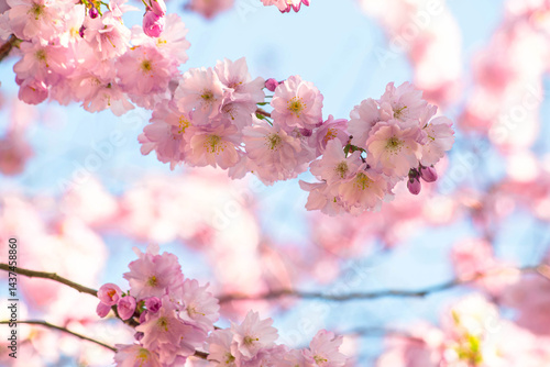 © Olga, Obraz premium Pink Cherry Blossom Branches Against a Bright Blue Sky in Spring in Hamburg