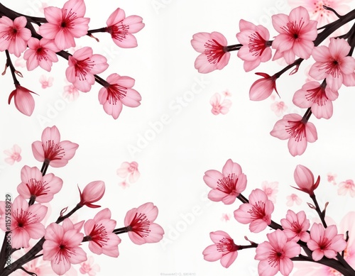 Fototapeta premium Pink cherry blossom branches bloom beautifully. Floral spring decor illustration shows delicate blossom flowers, buds. Japanese sakura tree spring elements. Beautiful springtime flora. Traditional
