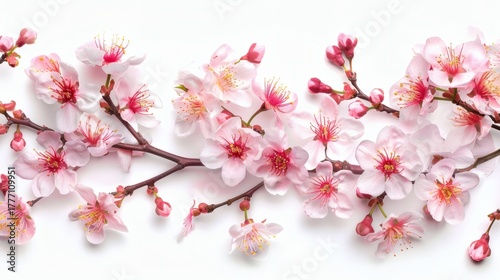 Obraz premium Pink cherry blossom branches with delicate flowers and buds arranged on white...