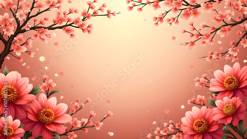 © Arief, Fototapeta premium Pink cherry blossom flowers blooming on a peach background. Springtime floral background for website banners and social media.