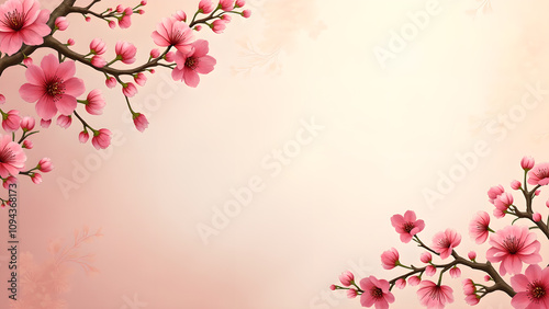 Naklejka premium Pink Cherry Blossom Flowers Branches on Peach Background. Spring Floral...