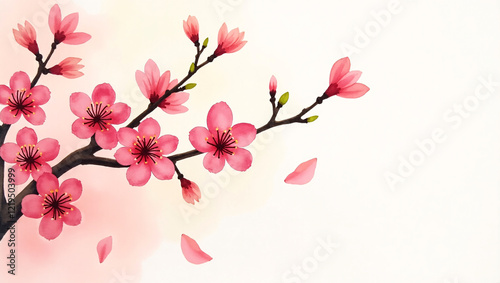 © ks_artify, Naklejka premium Pink cherry blossom flowers on white background with space for text, watercolor illustration.