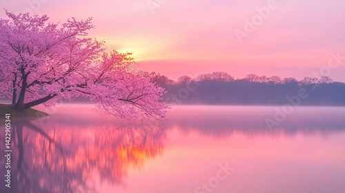© Lakshmi, Fototapeta premium Pink Cherry Blossom Sunrise over Lake
