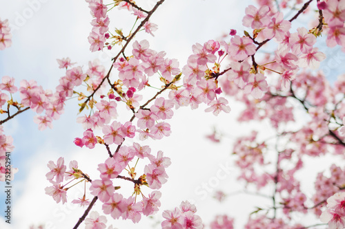 Obraz premium Pink cherry blossom under blue sky