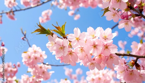 Fototapeta premium Pink cherry blossoms against a clear blue sky (1)