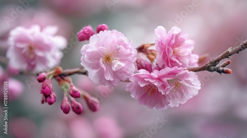 Fototapeta premium Pink cherry blossoms and buds create a serene spring scene highlighting...