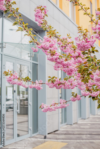 © eugenivy, Fototapeta premium Pink cherry blossoms decorating a modern cityscape