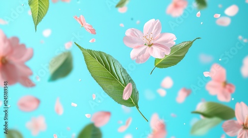 Fototapeta premium Pink cherry blossoms falling, blue background, spring, nature