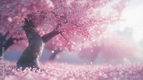 © Johan, Obraz premium Pink cherry blossoms falling on ground.