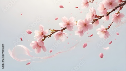 © HiSea, Fototapeta premium Pink Cherry Blossoms Falling on Light Blue Background