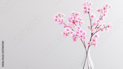 © artzone, Fototapeta premium Pink Cherry Blossoms in a Clear Glass Vase Against a White Background
