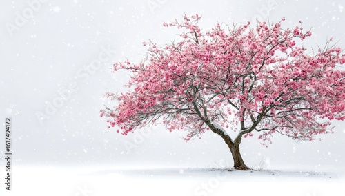 © Kota, Fototapeta premium Pink cherry blossoms on a snow-covered tree in winter
