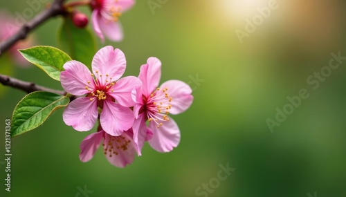© Sutasinee, Obraz premium Pink cherry plum blossoms against a green leafy background, cherry, pink