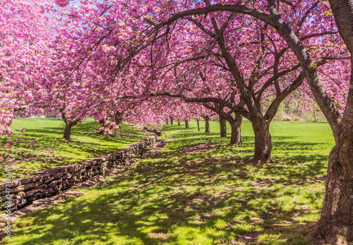 © rabbitti, Fototapeta premium Pink cherry trees drape gracefully near a stone canal