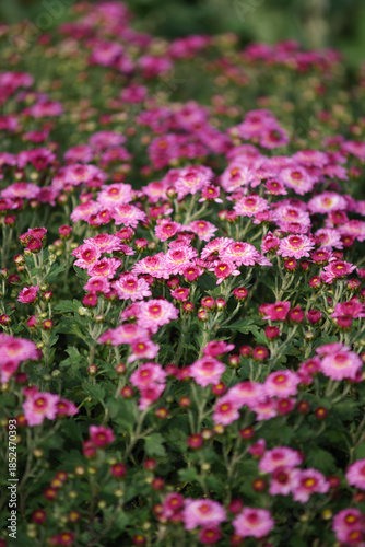 © 卖雪糕 撒哈拉, Fototapeta premium Pink chrysanthemum flowers blooming in a garden field