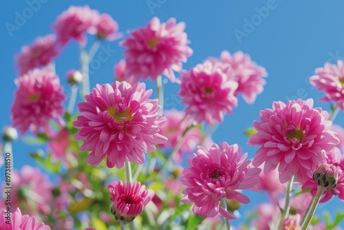 Obraz premium Pink chrysanthemums are blooming under a blue sky in a summer garden