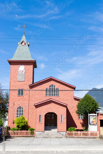 © Peruphotoart, Fototapeta premium Pink church standing tall in chile's patagonia region