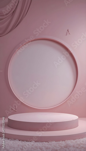 Obraz premium Pink Circular Stage Podium with Draped Fabric and White Ball Pit circle round