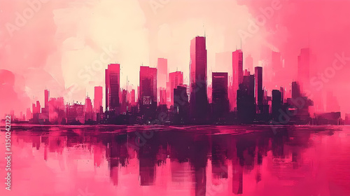 Fototapeta premium Pink city skyline reflection, urban sunrise, background art