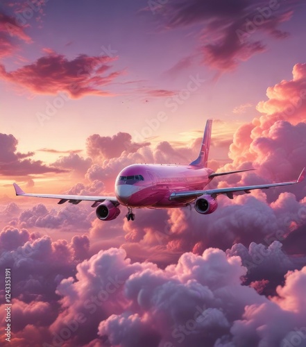 © chaiwat, Fototapeta premium Pink cloud layer envelops plane as it lands at sunset, sunset, flight