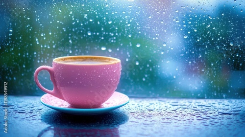 © Nurul, Fototapeta premium Pink coffee cup on rainy windowsill.