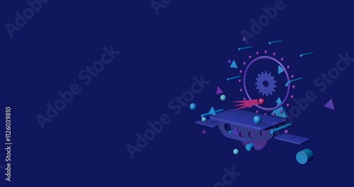 Fototapeta premium Pink comet symbol on a pedestal of abstract geometric shapes floating in the air. Abstract concept art with flying shapes on the right. 3d illustration on indigo background