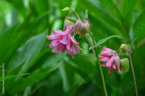 © Mariana, Obraz premium Pink common Columbine blooming flower in spring garden. Growing, planting flowers concept. Free copy space
