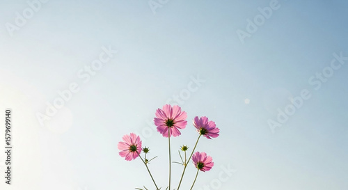 © NOBLE MAN, Naklejka premium Pink Cosmos Flower Against Light Blue Sky Background in Summer