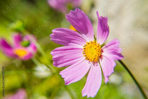 Fototapeta premium Pink cosmos flower close up on blurred background. Decorative garden plant.
