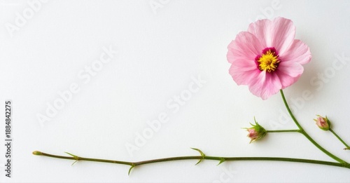 Fototapeta premium Pink cosmos flower rests upon white surface. Delicate petals, green stem...