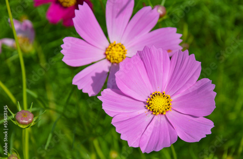 Obraz premium Pink cosmos flowers in full bloom at morning, blurred background