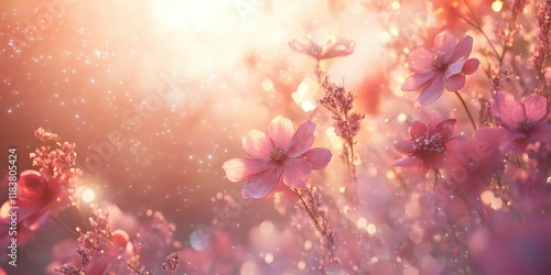 © novian, Fototapeta premium Pink Cosmos Flowers in Soft Golden Sunlight