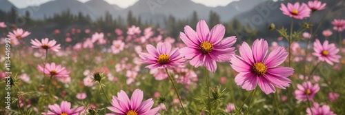 © methinee, Fototapeta premium Pink Cosmos flowers swaying in the morning breeze , grass, cosmos