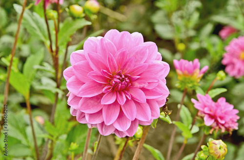 © posinote, Obraz premium Pink Dahlia flower or Decorative dahlias with green leaf