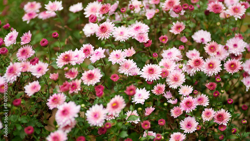 Fototapeta premium Pink daisies blooming in garden setting