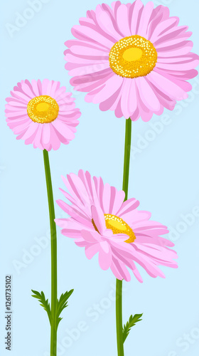 Fototapeta premium Pink daisies with yellow centers on blue background