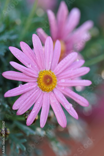 © MiguelAngel, Obraz premium Pink daisy flower showing water droplets after rain shower
