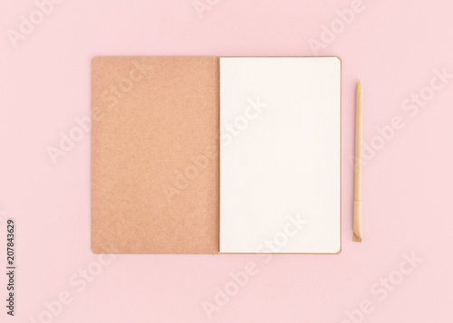 Fototapeta premium Pink desktop with notebook opened page and pen.