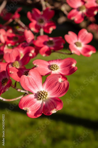 © woodsnorth, Obraz premium Pink dogwood flower blossoms in bright spring time sunshine