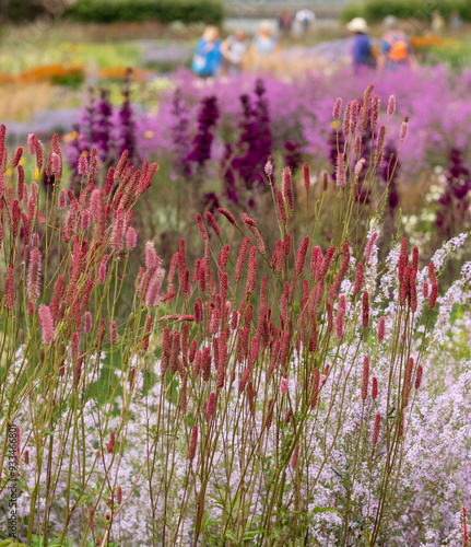 © Lois GoBe, Naklejka premium Pink drought resistant Sanguisorba flowers at Wisley garden, Surrey UK. The extensive flower beds have mainly perennial plants growing in them.