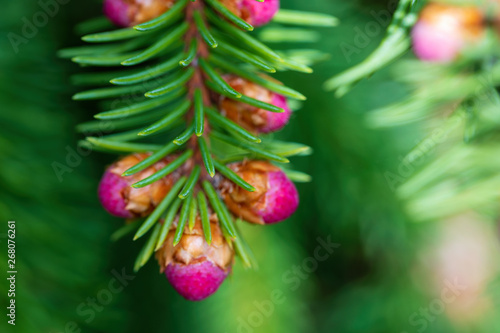 Fototapeta premium Pink escapes on brightly green branches of a fir-tree black at the beginning...