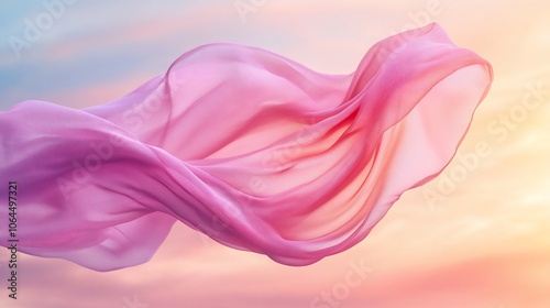 © milenialdesastudio, Obraz premium Pink fabric flowing in the wind against a colorful sunset sky.