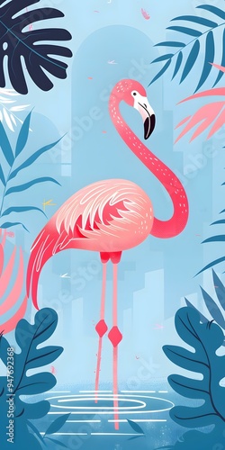 Fototapeta premium Pink Flamingo Bird Illustration With Tropical Leaves