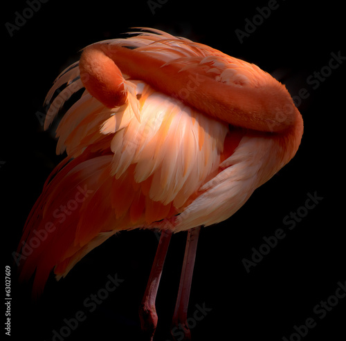 © Gail Johnson, Obraz premium Pink Flamingo birds preening themselevs Curacao Caribbean