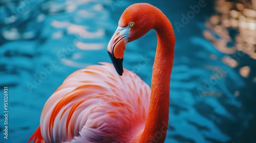 © nuryadin, Fototapeta premium Pink Flamingo Closeup Against Blue Water