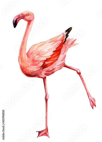 © Hanna, Fototapeta premium Pink flamingo cute bird exotic tropical wildlife isolated white background, watercolor illustration. Greeting card, poster