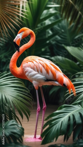 Fototapeta premium pink flamingo on a background of tropical leaves, background wallpaper for mobile phone