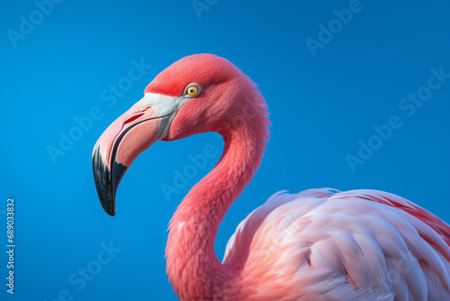 Obraz premium Pink Flamingo's Graceful Detail Against a Tranquil Blue Background. Ai generated
